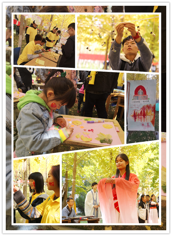 本届文化节设有四个主题十四项活动,主题一“思想引领守初心,爱国强国我做起”,由爱国主义海报展,马列主义经典诵读,活力团支部主题团日活动,党史、国史、校史知识竞答,祖国我想对你说等五项活动组成。同学们在活动现场欣赏爱国主义海报,诵读经典,认真图绘祖国七十周年华诞图标,学习党史校史,把自己对祖国的心里话流淌与金黄的银杏叶上。主题活动加强对当代青年的思想引领、理论教育以及红色基因传承,提升同学们的爱国热情,树牢社会主义核心价值观。