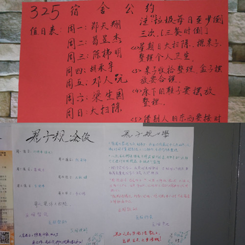 宿舍是同学们在学校的“家”,家有家规,宿舍公约就是由宿舍成员共同制定的“家规”,这个“家规”不是条条框框,不是鸿篇巨制,不是刻板教条,它就是实实在在生活的细枝末节,也是对宿舍小家的美好期望,更是大家的共同追求和目标;通过集体制定宿舍公约,引导员工们认识到宿舍是大家共同的生活空间,每个人都有爱护宿舍、建设宿舍的义务,制定宿舍公约的过程,也是宿舍成员相互沟通,相互了解,相互融合的过程,这个沟通过程不仅让大家学会包容,学会沟通,形成的宿舍公约也反过来形成了对大家的约束,而且制定的宿舍公约,也让大家看到了同学们个人才华与丰富创意的展示。